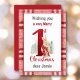 Cartão de Natal de 1rua para um bebê com um belo coelho de inverno na floresta de neve e grande número vermelho no fundo da xadrez. Personalize facilmente o texto ou deixe algum vazio dele. - Kate Eden Art