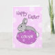 Cartão de saudação de primo felz pascoa com adoráveis ilustrações de ovo de Páscoa e coelho de Páscoa em rosa e roxo.
