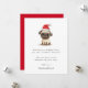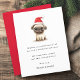 Cartão de Natal com um desenho fofo de um pug vestindo um chapéu de Papai Noel, e sua mensagem personalizada na frente. Cor vermelha ou personalizada de volta.
