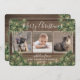 Envie saudações alegres e compartilhe três das suas fotos favoritas com um cartão de feriado de colagem de na moda. Todo o texto nesta modelo é simples de personalizar para incluir qualquer texto, como Feliz Natal, Felizes Feriados, Saudações de Ano Novo, Cheers de Ano Novo, etc. (DICA DE PLACEMENTO DE IMAGEM: Uma maneira fácil de focalizar uma imagem exatamente como você deseja é recortá-la antes de ser carregada no site do Zazzle.) O design moderno estilo de fazenda apresenta um fundo de madeira castanho-vintage, verde-pinheiro botânico rústico com lamparina, tipografia com estilo manuscrito moderno, e uma grade fotográfica única com 3 imagens quadradas de sua escolha. A família e os amigos adorarão mostrar esta elegante carta personalizada.
