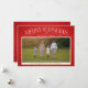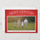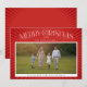 A tipografia elegante com turbilhões em um fundo vermelho de raios brilhantes enquadra uma foto de feriado favorita. O espaço no verso tem espaço para fotos adicionais ou mais mensagens de feriado.