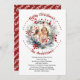 Este cartão de Natal mostra uma coroa de galho embelezada com bagas vermelhas e uma fotografia da família. A saudação "Feliz Natal" aparece acima da imagem, enquanto o nome da família é exibido elegantemente abaixo de ambos em um roteiro fluente, seguido de pontos vermelhos. Uma mensagem pessoal a tinta preta transmite desejos calorosos ao receptor por baixo da foto. O verso apresenta um fundo vermelho rico, com um padrão feito da frase 'Feliz Natal' em branco, posicionado na diagonal.