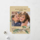 Um papel kraft bronzeado parece um cartão de convite para férias de fundo que é fácil de personalizar com sua foto, nomes, ano atual e uma breve saudação! Este cartão de férias de aparência natural e simplista apresenta uma coroa de bagas, galhos e fita atrás, um pedaço de bagas, galhos e fita na frente. O texto da tipografia negra nos fundos lê Paz e Joy! Fotografia © Storytree Studios, Stanford, CA
