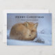 Um cartão de feriado plano com uma fotografia da natureza do querido com uma fox vermelha fofa fofa giro enrolada em uma bola descansando na neve fria do inverno.