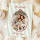 Mande alegria quente de feriado com este Cartões de foto de Natal elegante listrado. Apresentando um fundo verde e listrado branco macio, este design enquadra lindamente a foto da sua família com um sotaque vermelho festivo e escalpado e arco. A saudação alegre de "Feliz Natal" aparece no topo em uma escrita divertida, enquanto seu nome de família é destacado na parte inferior para um toque personalizado.