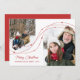 Cartaz de Natal encantador com duas fotos em forma de arco adornada com cordas vermelhas correndo através do cartão decorado com pequenas estrelas e pontos vermelhos.