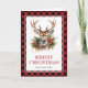 Xadrez de búfalos vermelhos Cartão de Natal Merry com a ilustração aquosa de um veado rodeado pela decoração de Natal de Holly, Pines e Enfeites de natal. Personalize facilmente este cartão de feriado com aquarela com o seu nome e texto de família.