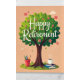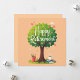 Uma ilustração alegre que apresenta uma árvore grande e vibrante com folhas verdes e flores cor-de-rosa. Debaixo da árvore, uma cena acolhedora se desdobra com uma xícara de café a vapor e um pote de lápis coloridos, sugerindo criatividade e relaxamento.