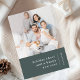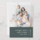 Um cartão de saudação simples com fotos de feriado moderno na moda com uma tipografia clássica que cita "alegria de feriado e feliz ano novo" com uma linha divisória e um nome de família com uma direção vertical de texto em branco. O design tem uma cor verde de floresta escura e está no estilo design escandinavo 'scandi'. A foto, a saudação e o nome podem ser facilmente personalizados para um design tão exclusivo quanto você. Uma design moderna, minimalista e contemporânea para se destacar nesta temporada de férias! A imagem mostrada é apenas para fins de ilustração para ser substituída pela sua própria foto. A imagem de marcador é de um retrato familiar com mãe, pai, 2 filhas e um cão aterrorizante de russel com um pano de fundo minimalista neutro.