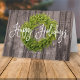 O design é composto por uma luva de folhagem verde e lúcida sobre um fundo de madeira escura, com um cartões de natal escrito em tipografia serif. Disponível aqui: http://www.zazzle.com/store/selectpartysupplies