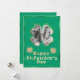 Esta Rua personalizada. O cartão de saudação do Dia de Patrick apresenta um quadro fotográfico de trevo com sorte em um fundo verde. O quadro apresenta um brilho dourado e um design de folha verde. Um exemplo de foto é colocado em dentro que você pode personalizar para incluir sua própria foto personalizada ou outra imagem. A Rua Feliz. A saudação do Dia de Patrick é impressa em uma folha verde correspondente e uma letra brilhante dourada. Dois pavimentões são colocados em ambos os lados.