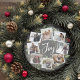 Um design de cartão festivo em forma redonda única que apresenta oito das suas fotos favoritas organizadas em um design de coroa redonda, acentuado pela folhagem verde de aquarela, cones de pínus e bagos vermelhos no fundo do quadro. "Joy" aparece no centro em tipografia de pincel com letra branca. Personalize a parte de trás deste design de colagem de fotos de feriado exclusivo com sua saudação de Natal personalizada e nomes em letras brancas em vermelho.