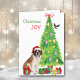 Na frente deste cartão de Natal, um Santo Bernard Dog veste um chapéu de Papai Noel enquanto se senta ao lado de uma árvore de Natal. Pacotes de presentes embalados de forma breve estão espalhados, e um touchete está pousando na árvore de Natal. O texto vermelho e verde diz "JOY Natal". O dentro é um texto estilizado que diz MERRY CHRISTMAS, e um campo de texto para personalizar.