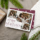 Nosso design de cartão festivo e elegante é a maneira perfeita de mostrar três de suas fotos de família favoritas. Design horizontal ou orientada para a paisagem apresenta "Felizes Feriados" em tipografia burgundy e roteiro com letra de mão, com seu nome familiar embaixo.