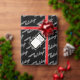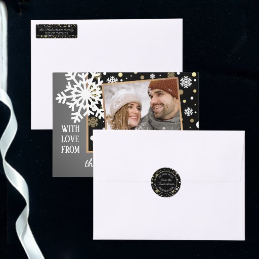 Cartão de Férias Único, clássico, de moda, bonito e decorativo. Fofo COM AMOR DO texto e da sala para personalizar ou personalizar com uma foto e nomes (ou nome da família) de sua escolha em um design de padrão de flocos de neve espalhados por diversão em um plano de fundo preto e cinza. E um poema de saudação de estação personalizável na parte de trás do cartão.