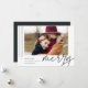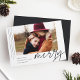 Um cartão de férias moderno e elegante com uma fotografia horizontal ou orientada à paisagem, acentuado com faixas verticais finas. A "Feliz" aparece por baixo da tipografia casual escrita com letra de mão. Personalize com seu cartões de natal personalizado, seu nome de família e o ano. Uma escolha moderna e moderna minimalista para os cartões de Natal 2021.