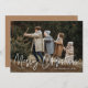 Cartões com fotos modernos de férias com sua foto horizontal com "Feliz Natal", mostrados em um roteiro escrito à mão. Personalize o cartão fotográfico de Natal com seu nome de família e o ano. A placa de feriado de fotos do solteiro reverte para exibir um fundo marrom-caramelo com sutis pontos brancos.