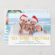 Encomendamento rápido e fácil! Celebrando um Natal costeiro ou indo à praia para as férias? Você trará um sorriso para os rostos de seus amigos e familiares quando você enviar a eles este cartão com fotos de "Saudações de areia do Mar". Com um trocadilho engraçado, este design de feriado náutico tem listras azuis, tipografia de ouro e espaço para 3 fotos. Este cartão de anos novos de praia é perfeito para climas mais quentes.
