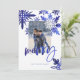 Cartão festivo moderno, arrojado e abstrato, com os nossos flocos de neve de tinta gravada com tinta gravata, pintados à mão. O ousado padrão de floco de neve cria um olhar moderno e na moda. "Feliz" é exibida em uma tipografia moderna do script de pincel azul do índio. Personalize com uma foto, assinatura familiar e ano. O verso apresenta um fundo de índio com um padrão de coloração branca. Trabalho de arte por Moodthology Papery.