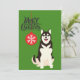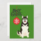Sorriso de Cachorro Siberiano com ornamento vermelho e texto de Feliz Natal sobre fundo verde