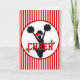 O design do Natal do divertimento para o cheerleader caracteriza um fundo vermelho e branco da listra. Há um círculo branco no centro com guarnição vermelha. Dentro do branco o círculo é uma silhueta preta de um cheerleader que salta no ar com poms outstretched do pom da terra arrendada de braços. O cheerleader está vestindo um chapéu vermelho e branco de Papai Noel. Através do cheerleader é a palavra ELOGIO na pia batismal vermelha corajosa do estilo do jérsei. O elogio da palavra é decorado com os dois sprigs do azevinho. Dentro do cartão é o texto customizável na mesma pia batismal do estilo do jérsei no preto. Este é o cartão de Natal perfeito para treinadores, cheerleaderes, e famílias do elogio!! Espalhe o ELOGIO do feriado!