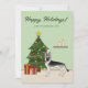 A ilustração original do desenho animado de Destei de um cão da raça German shepherd prateada / preto e prateado. O cachorro está parado por uma árvore festiva de Natal decorada com ornamentos vermelhos e amarelos, uma pérola branca e uma estrela amarela que é colocada no topo da árvore. Há também dois presentes envoltos pela árvore e atrás do cachorro há uma prateleira marrom com duas velas. A cor do chão é bege e a cor de fundo é verde-claro. Há também duas áreas de texto personalizáveis.