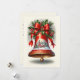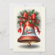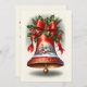Um sino de Natal ricamente decorado, completo com uma fita vermelha exuberante e raminhos de azevinho, emoldura uma cena pitoresca de uma vila de inverno. A igreja e as casas cobertas de neve evocam uma sensação de nostalgia, enquanto os flocos de neve que caem suavemente adicionam à atmosfera mágica.