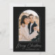 Cartão de Natal moderno com a sua foto vertical moldada por um arco pontilhado com fundo preto (ou cor da sua escolha). "Feliz Natal" é exibido em letras de roteiros brancos. Personalize a frente do cartão, adicionando o nome da sua família e o ano. A placa se inverte para exibir um padrão de linha pontilhada branca.