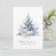 Um veado de bebê elegante é aninhado num pinheiro de inverno com neve rústica. Feliz Natal está escrito em um simples roteiro abaixo, com uma linha adicional abaixo para personalizar o design ainda mais. Todo o texto deste cartão pode ser editado. Há uma mensagem de Natal para você personalizar nas costas.