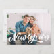 Placa de Feriado de Sobreposição de Fotografias com Script Brancos de Feliz ano novo Branco | Enviar saudações de ano novo à família e aos amigos com este cartão plano de feriado personalizável dos Anos novos. Ele apresenta uma camada ousada de script retrô e padrão festivo. Personalize adicionando nome, ano e foto. Disponível como uma placa plana e dobrada.