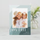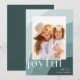 Um design de cartão de feriado chic e elegante com uma foto vertical ou orientada para o retrato de solteiro em um layout arquitetado único, formado por formas de faixa orgânica em tons suaves de aqua e verde-roxa. "Joyful" aparece por baixo da sua foto em um tipo subestimado, com o ano na dentro da letra "o" na parte superior esquerda, com o nome da sua família na parte inferior direita. Personalize com seu nome de família no canto inferior direito para o toque final perfeito para estes cartões com fotos de Natal 2021 inspirados na natureza.