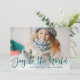 Crie seus cartões com fotos de férias rápida e facilmente com este design simples e elegante. A placa apresenta sua foto favorita horizontal ou orientada a paisagem em sangria de cheio, com "alegria para o mundo" sobreposta em caracteres de roteiro verde. Personalize com seus nomes e o ano na base. Cartões invertem para um padrão geométrico moderno em verde e branco.