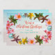 Um cartão de boas-vindas de Natal quente com muitas flores de plumeria e estrelas-do-mar que fazem uma fronteira em torno do texto. Personalize com sua escolha de saudação e adicione uma assinatura. Uma praia oceânica é o fundo desta design de férias tropical, e ela carregar para trás de cartas modernas e planas. Altere o tamanho se desejar e forem oferecidas atualizações de papel.