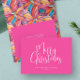 Estes cartões de Natal que não são fotografias, em moda, contêm as palavras "Feliz Natal" na tipografia elegante do roteiro. Use os campos modelo para adicionar sua personalização. A placa é aberta para um padrão floral exclusivo e colorido poinsettia de cor d'água com espaço para seu texto personalizado. Uma escolha única e brilhante para as suas placas de cartões de natal pinkmas. Para ver mais designs como esta visite www.zazzle.com/dotellabelle Arte original de aquarela por Victoria Grigaliunas do Do Tell A Belle.