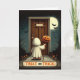 Um truque adorável ou uma criança tratada numa fantasia segura uma abóbora sobre um bastão e está à porta da frente pronta para ser tratada nesta vintagem tematizada saudação de Halloween.