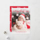 Este cartão de Natal simples e na moda apresenta sua foto pessoal na frente, com as palavras "feliz natal" em um roteiro vermelho moderno. Adicione seus nomes à frente. A parte de trás apresenta um padrão tendencioso de folhas vermelhas e brancas.