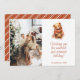 Possui um bonitinho urso de aquarela pintado com um cachecol na frente com o texto "Desejando-lhe o feriado mais quente e alegre!", foto da família, e texto para assinar com o nome da família e o ano. O dorso apresenta uma cor correspondente ao cachecol/urso e tem listras brancas e douradas. Envie os desejos de feriado mais calorosos e alegres nesta temporada de inverno. Feliz Natal!