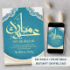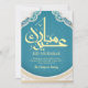 This card features a stunning turquoise blue background with traditional Islamic geometric motifs. The white and gold frame provides a modern and fresh look for your holiday greetings.