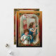 Ilustração de feriado vitoriana restaurada de forma elegante, apresentando o Velho Mundo Pai Natal com crianças no coração da família e saudação de Feliz Natal enquadrada por um quadro em estilo gótico ornamentado vermelho, verde e dourado, e um fundo artístico coordenador. Recursos traseiros que correspondem a quadro, textura de papel antiga e campos de texto editáveis.