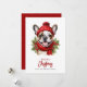 Bonita ilustração do estilo aquarela de um adorável Bulldog Francês vestindo um cachecol vermelho e chapéu num fundo de verde natal.