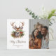 Cartão de Natal com fotografia a aquarelas, com veado rodeado por decoração de Natal de galhos de pinheiro, Enfeites de natal holly e vermelha na frente e no inverno de botânicos brancos, bagas vermelhas e verde no verso. Personalize facilmente este cartão festivo de férias com a sua fotografia e o seu texto.