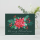 Esta design apresenta uma flor vermelha de poinsettia, pintada manualmente, com cor d'água vermelha, em estilo tradicional de Natal, com outros florais vermelhos e folhagem botânica emparelhados com um conjunto elegante de fontes contra um fundo verde-escuro. No verso está um padrão que apresenta flores de poinsettia, sagradas, bagas e canas doces. Personalize o texto neste design. Veja toda a coleção correspondente.