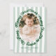 Send joyful holiday greetings with this whimsical Christmas photo card featuring your vertical photo framed in an oval surrounded by “Merry Christmas” in a playful handwritten dark green script. The background showcases soft watercolor green stripes for a festive yet modern touch. Personalize with your family name and the year below in matching green lettering. The back includes a second square photo with space beneath for your custom message, creating a stylish and cheerful keepsake for the season.
