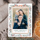 Compartilhe desejos calorosos com este cartão com fotos de feriado cômico com um arco de fita vermelho-aquática e um verde-inverno que enquadra sua foto favorita da família. A design moderna, porém elegante, inclui sotaques sutis de bagas sagradas e estilos de sentimento de "Feliz Natal", com espaço atrás para uma segunda foto e mensagem personalizada. Uma forma festiva e eterno de mostrar fotos da família enquanto destaca a fita vermelha e os detalhes do arco que seus destinatários irão adorar.