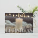 Linda vela branca, ornamentos e cobertores jogam na frente deste cartão de cartões de natal plano com Feliz Natal em letra chica e sua saudação personalizada nas costas. Selecione Matte para o papel mais pesado e alta definição para melhor qualidade de impressão.