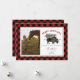 Ilustração de um búfalo vestindo um chapéu de Santa com neve coberta de árvore de Natal amarrada às costas. Borda e verso são design de padrão de xadrez de búfalo preto e vermelho. Personalize com sua foto de família.