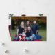 Compartilhe quatro das suas fotografias familiares favoritas com este cartão de Natal simples, mas elegante, com "JOY" em tipografia ousada de xadrez de búfalos vermelhos, e os seus nomes e saudações num fundo branco de madeira. Uma imagem aparece na parte frontal e outra na parte traseira que preenche a parte traseira inteira da placa.