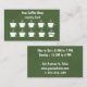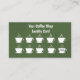 Procurando um cartão de fidelidade que seja tão otimizado quanto sua rotina matinal? Esta design verde minimalista é perfeita para o amante de café ecologicamente consciente que aprecia a simplicidade e a sustentabilidade. As linhas limpas e a matiz verde-suja criam uma sensação sofisticada, enquanto a seção de carimbo de fidelidade mantém o rastro das recompensas com um toque de elegância subestimada. Este cartão é mais do que funcional - é uma declaração sutil sobre os seus valores. Mostre seu compromisso com café de qualidade e responsabilidade ambiental em cada compra. Então jogue fora as cartas volumosas e abraça a combinação perfeita de estilo e sustentabilidade. Comece a colecionar selos na sua próxima xícara hoje!