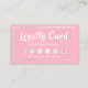 Estes modernos e elegantes cartões perfurados de fidelidade do cliente, cor-de-rosa e branco, com sotaques falsos de relâmpago prateado, são uma forma glamourosa de trazer seus clientes de volta para mais, agradecendo-lhes por seus repetidos negócios com uma recompensa. Esses cartões de fidelidade têm o nome de sua empresa de um lado, com 6 círculos para bater em cada serviço ou compra. O sexto tem coração e dá direito ao seu cliente ou cliente a sua oferta especial, que você pode personalizar no cartão, seja um desconto ou graça. O lado oposto tem um lugar para seu logotipo personalizado e suas informações de negócios: seu nome, título, endereço, telefone, informações de mídia social e site (que você pode substituir por seu endereço se desejar. Excelente maneira de mostrar sua apreciação, seja um salão de beleza, salão de unhas, artista de sobrancelha, estilista de cabelos ou provedor de serviços independente.