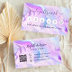 Uma tendência holográfica em cor rosa, roxo, azul. Na frente: adicione desconto. Voltar: Personalize e adicione seu nome, título, número de telefone, email, endereço do site, código qr ao seu site. Letras roxas.